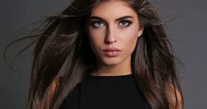 gorgeous sensual woman with dark straight hair wears elegant clo